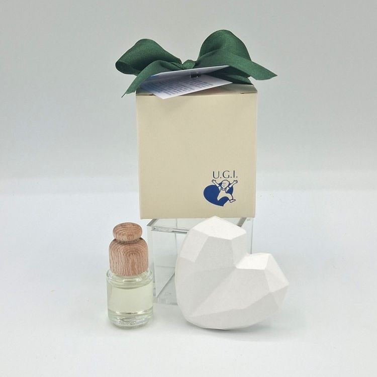 DettagliScatolina di cartone personalizzata con logo (cm 7x6,5x6,5) al cui interno viene inserito un cuore diamantato in gesso ...