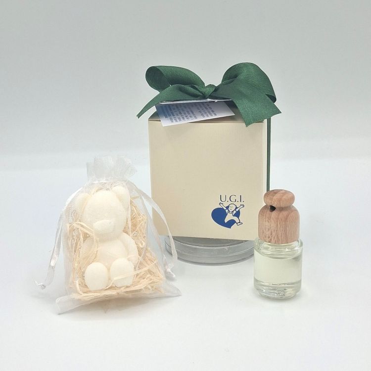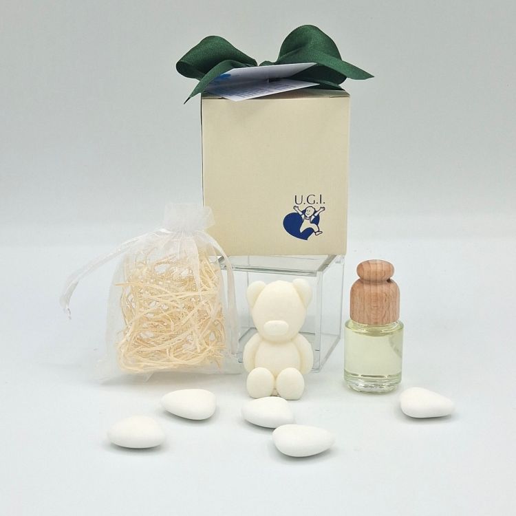 DettagliScatolina di cartone personalizzata con logo (cm 7x6,5x6,5) al cui interno viene inserito un orsetto (5x3 cm) in cera ...