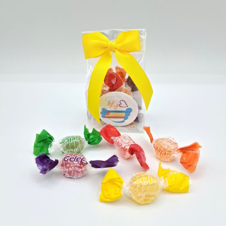 Sacchetto écru in lino (misura 9 x 12 cm circa) con nastro di colori vari, minidépliant e ciondolo ...