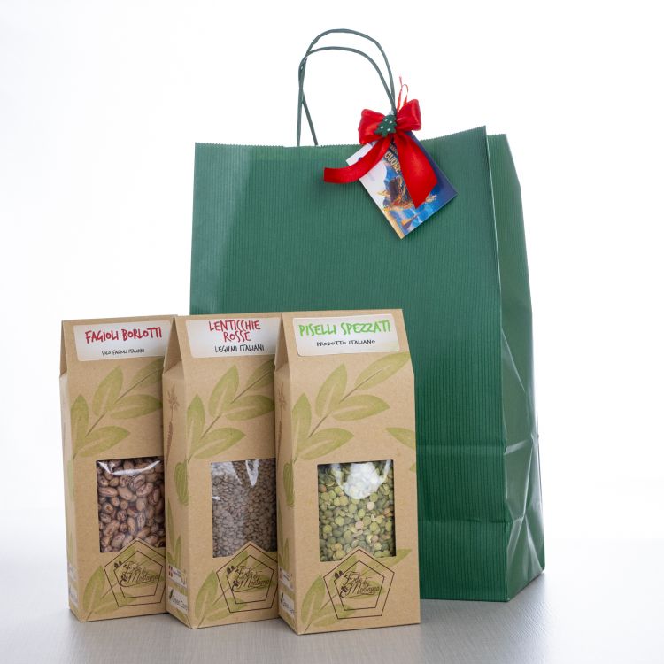 DettagliConfezione regalo contenente: Lenticchie rosse decorticate in astuccio Erbe di Montagna (Pianfei) 400 g Piselli ...