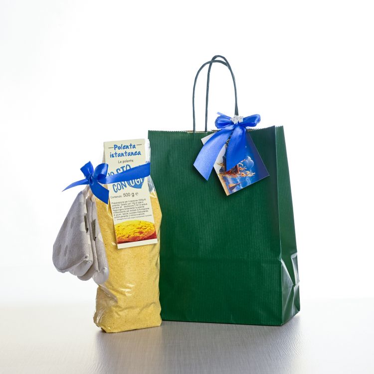 Confezione regalo contenente: Polenta istantanea Erbe di Montagna (Pianfei) 500 g Coppia di presine in ...