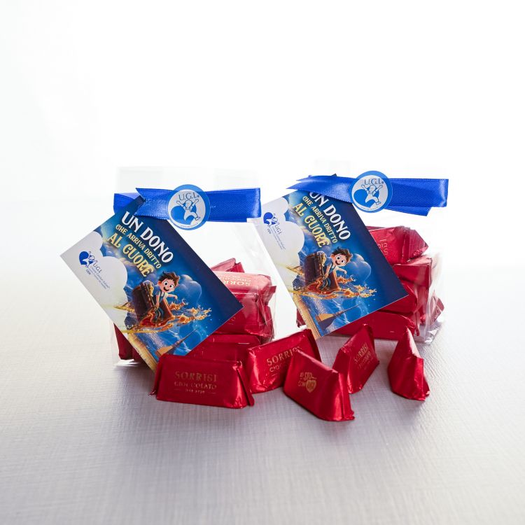 DettagliSacchetto trasparente contenente g 150 di gianduiotti* Boella & Sorrisi (personalizzati UGI) confezionati con ...