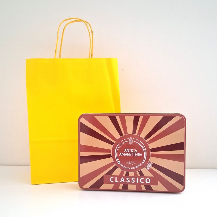 Scatola in latta (cm 21x16x4) contenente amaretti* morbidi alla mandorla Torroneria D. Barbero (Asti) 150 g, confezionata all'interno di un sacchetto di carta colorata.